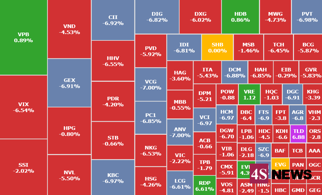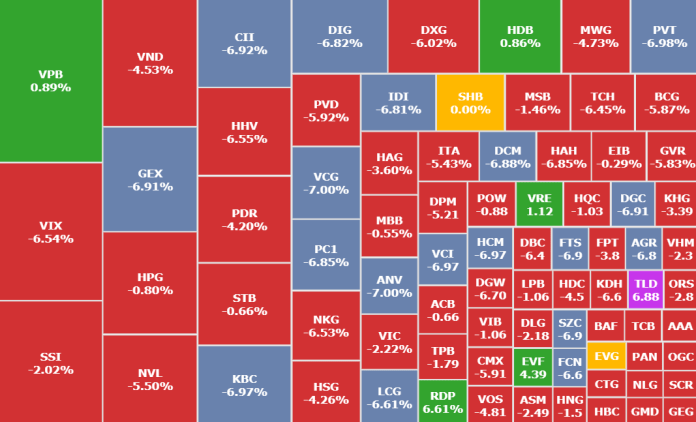 Đóng cửa, ngoại trừ sản xuất thiết bị máy móc còn xanh nhẹ, các chỉ số ngành còn lại đều giảm sâu trong đó khai khoáng, chứng khoán, nhựa – hóa chất, thủy sản giảm quanh 5%; ngân hàng là nhóm giữ nhịp thị trường với mức giảm chỉ 0,36% nhờ lực kéo VPB và HDB (cùng tăng 0,9%).