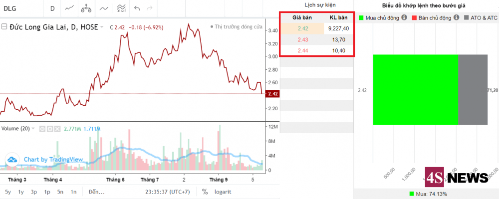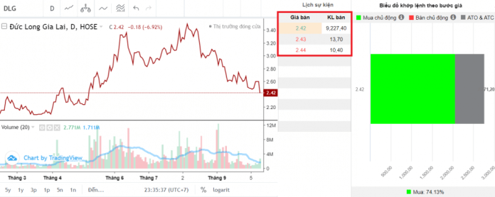 Ngay sau khi thông tin Đức Long Gia Lai bị Tòa án ra quyết định mở thủ tục phá sản phát đi ngày 12/10, ngay đầu phiên giao dịch 13/10, cổ phiếu DLG lập tức giảm sàn ngay ATO với gần 0,7 triệu đơn vị được sang tay. Mã đóng phiên duy trì mức giá sàn 2.420 đồng/cp; khối lượng khớp lệnh gần 2,8 triệu đơn vị và dư bán sàn 9,2 triệu cp.